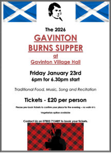 We hope to have you join us at our Annual Burns Supper at Gavinton Village Hall.